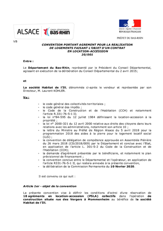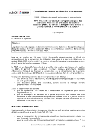 Le présent rapport propose à la Commission Permanente d’attribuer des agréments pour des prêts sociaux de location-accession (PSLA) concernant deux opérations de la société HABITAT DE L’ILL à Mommenheim et à Altorf.