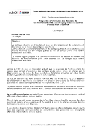 La politique éducative du Département joue un rôle fondamental de socialisation et d'ouverture sur le monde des collégiens bas-rhinois. Le Département assume le fonctionnement des collèges publics et privés et attribue des moyens financiers aux 90 collèges publics et aux 13 collèges privés sous contrat d'association avec l'Etat. Le présent rapport propose à la Commission Permanente de décider du montant des dotations de fonctionnement pour 2020 destinés aux 13 collèges sous contrat d’association avec l’Etat.