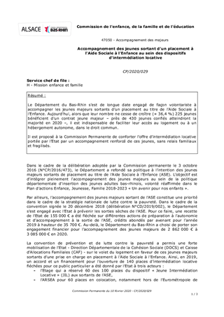 Le Département du Bas-Rhin s’est de longue date engagé de façon volontariste à accompagner les jeunes majeurs sortants d’un placement au titre de l’Aide Sociale à l’Enfance. Aujourd’hui, alors que leur nombre ne cesse de croître (+ 36,4 %) 225 jeunes bénéficient d'un contrat jeune majeur – près de 430 jeunes confiés atteindront la majorité en 2020 –, il est indispensable de faciliter leur accès au logement ou à un hébergement autonome, dans le droit commun. Il est proposé à la Commission Permanente de conforter l’offre d’intermédiation locative portée par l’Etat par un accompagnement renforcé de ces jeunes, sans relais familiaux et fragilisés.