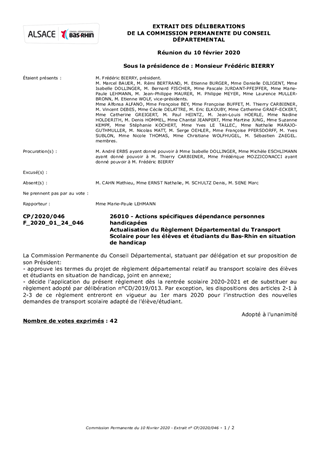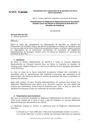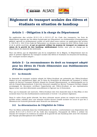 Dans le cadre des compétences du Département du Bas-Rhin en matière de financement du transport scolaire des élèves et étudiants en situation de handicap et de la mise en place de la future Collectivité européenne d'Alsace, le présent rapport soumet à l'approbation de la Commission permanente les évolutions du Règlement Départemental du Transport Scolaire pour les élèves et étudiants en situation de handicap du Bas-Rhin.