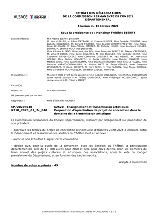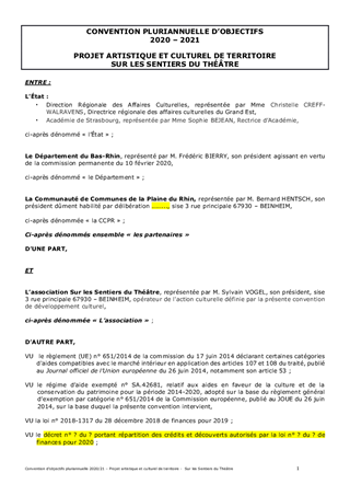 Le Département du Bas-Rhin a décidé, par délibération du Conseil Départemental du 13 décembre 2018, d’adopter le schéma d’orientation pour la culture et le patrimoine pour la période 2018-2021. Ce schéma fixe l’objectif de garantir des services culturels de proximité dans le domaine de la création artistique, de la diffusion artistique, de la pratique artistique en amateur, de l'enseignement artistique et de l'éducation artistique et culturelle. Le présent rapport a pour objet de proposer à la Commission Permanente d’approuver les termes du projet de convention pluriannuelle d’objectifs 2020-2021 à conclure entre le Département et l’association Les Sentiers du Théâtre, la Communauté de Communes de la Plaine du Rhin et l’État, et d’autoriser son Président à signer cette convention.