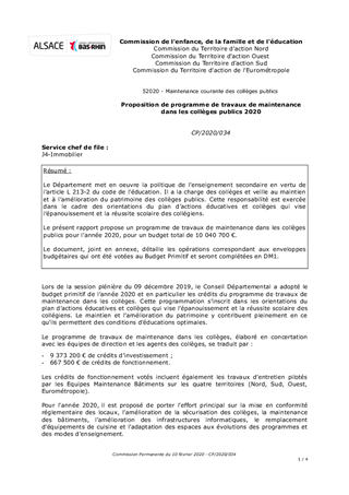 Le Département met en oeuvre la politique de l’enseignement secondaire en vertu de l’article L 213-2 du code de l’éducation. Il a la charge des collèges et veille au maintien et à l’amélioration du patrimoine des collèges publics. Cette responsabilité est exercée dans le cadre des orientations du plan d’actions éducatives et collèges qui vise l’épanouissement et la réussite scolaire des collégiens. Le présent rapport propose un programme de travaux de maintenance dans les collèges publics pour l’année 2020, pour un budget total de 10 040 700 €. Le document, joint en annexe, détaille les opérations correspondant aux enveloppes budgétaires qui ont été votées au Budget Primitif et seront complétées en DM1.