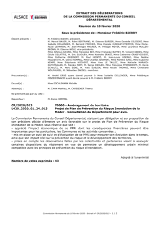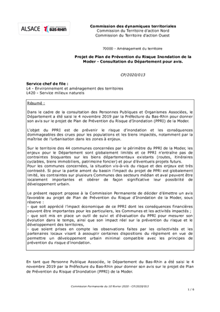 Dans le cadre de la consultation des Personnes Publiques et Organismes Associées, le Département a été saisi le 4 novembre 2019 par la Préfecture du Bas-Rhin pour donner son avis sur le projet de Plan de Prévention du Risque d’Inondation (PPRI) de la Moder. L'objet du PPRI est de prévenir le risque d’inondation et les conséquences dommageables des crues pour les populations et les biens impactés, notamment par la maîtrise de l’urbanisation dans les zones à enjeux. Sur le territoire des 44 communes concernées par le périmètre du PPRI de la Moder, les enjeux pour le Département sont globalement limités et ce PPRI n’entraîne pas de contraintes bloquantes sur les biens départementaux existants (routes, itinéraires cyclables, biens immobiliers, patrimoine foncier) et pour d’éventuels projets futurs. Pour les communes concernées, la situation vis-à-vis du risque et des enjeux est très contrasté. Si pour la partie amont du bassin l’impact du projet de PPRi est globalement limité, les contraintes sur plusieurs Communes des secteurs médian et aval peuvent être localement importantes et obérer de façon significative leur possibilité de développement urbain. Le présent rapport propose à la Commission Permanente de décider d’émettre un avis favorable au projet de Plan de Prévention du Risque d’Inondation de la Moder, sous réserve : - que soit apprécié l’impact économique de ce PPRI dont les conséquences financières peuvent être importantes pour les particuliers, les Communes et les activités impactés ; - que soit mis en place un outil de suivi et d’évaluation du PPRI pour mesurer son évolution dans le temps, ainsi que son impact réel sur la prévention du risque et le développement des territoires, - que soient prises en compte les observations faites par les collectivités et les partenaires locaux visant à assouplir certaines dispositions du règlement en vue de permettre un développement urbain minimal compatible avec les principes de prévention du risque d'inondation.