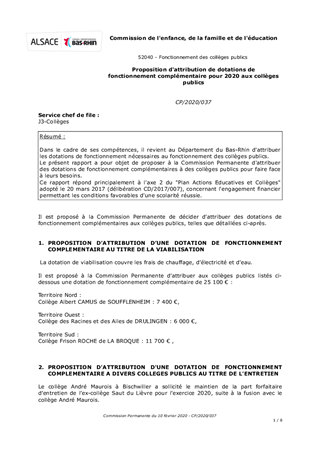Dans le cadre de ses compétences, il revient au Département du Bas-Rhin d'attribuer les dotations de fonctionnement nécessaires au fonctionnement des collèges publics. Le présent rapport a pour objet de proposer à la Commission Permanente d'attribuer des dotations de fonctionnement complémentaires à des collèges publics pour faire face à leurs besoins. Ce rapport répond principalement à l'axe 2 du "Plan Actions Educatives et Collèges" adopté le 20 mars 2017 (délibération CD/2017/007), concernant l'engagement financier permettant les conditions favorables d'une scolarité réussie.