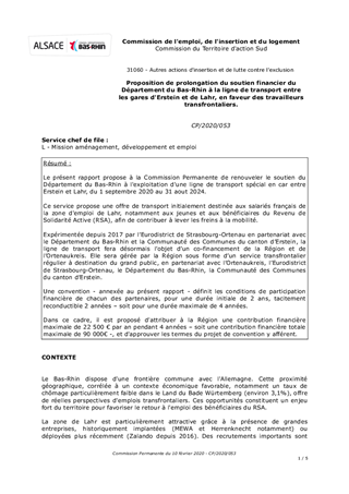 Proposition de prolongation du soutien financier du Département du Bas-Rhin à la ligne de transport entre les gares d'Erstein et de Lahr, en faveur des travailleurs transfrontaliers.