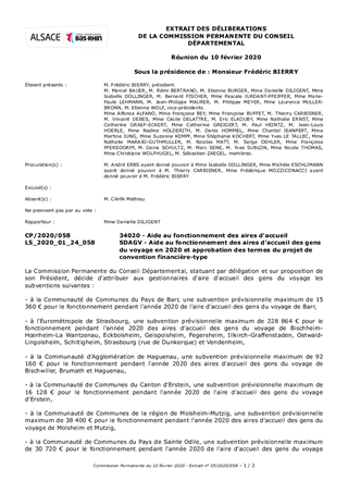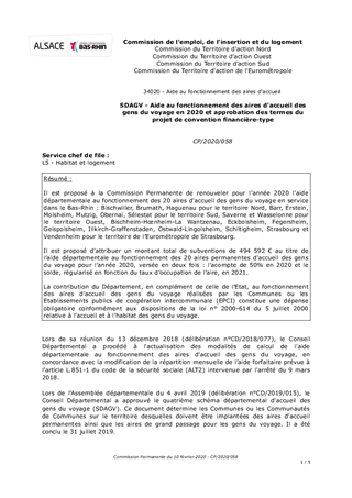 Il est proposé à la Commission Permanente de renouveler pour l’année 2020 l'aide départementale au fonctionnement des 20 aires d'accueil des gens du voyage en service dans le Bas-Rhin : Bischwiller, Brumath, Haguenau pour le territoire Nord, Barr, Erstein, Molsheim, Mutzig, Obernai, Sélestat pour le territoire Sud, Saverne et Wasselonne pour le territoire Ouest, Bischheim-Hœnheim-La Wantzenau, Eckbolsheim, Fegersheim, Geispolsheim, Illkirch-Graffenstaden, Ostwald-Lingolsheim, Schiltigheim, Strasbourg et Vendenheim pour le territoire de l’Eurométropole de Strasbourg. Il est proposé d’attribuer un montant total de subventions de 494 592 € au titre de l’aide départementale au fonctionnement des 20 aires permanentes d’accueil des gens du voyage pour l’année 2020, versée en deux fois : l’acompte de 50% en 2020 et le solde, régularisé en fonction du taux d’occupation de l’aire, en 2021. La contribution du Département, en complément de celle de l’Etat, au fonctionnement des aires d'accueil des gens du voyage réalisées par les Communes ou les Etablissements publics de coopération intercommunale (EPCI) constitue une dépense obligatoire conformément aux dispositions de la loi n° 2000-614 du 5 juillet 2000 relative à l’accueil et à l’habitat des gens du voyage.