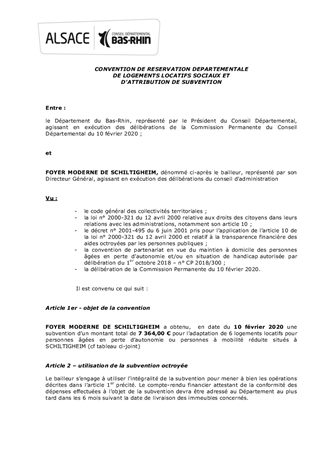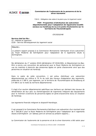 Le présent rapport propose à la Commission Permanente l’attribution d'une subvention au Foyer Moderne de Schiltigheim pour l’adaptation de 6 logements situés à Schiltigheim.