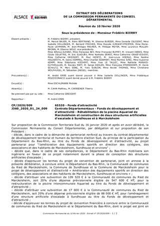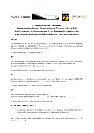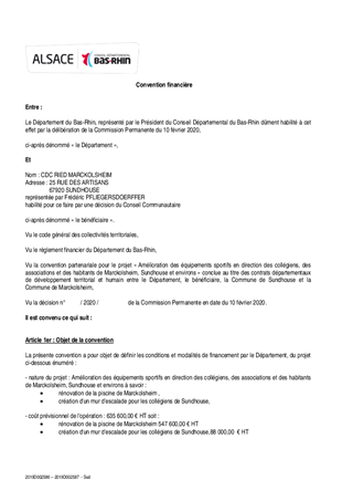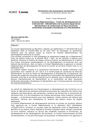 Le Conseil départemental du Bas-Rhin a décidé, par délibérations n° CD/2016/158 du 8 décembre 2016 et CD/2017/004 du 20 mars 2017 de développer un partenariat renforcé avec les acteurs locaux au travers de contrats départementaux de développement territorial et humain. Ces contrats constituent le volet stratégique du partenariat engagé par le Département avec les acteurs locaux sur la période 2018 – 2021. Ils ont vocation à traduire une ambition collective à l’échelle de chaque territoire d’action du Département et à définir les enjeux prioritaires d’aménagement et de développement co-construits avec les acteurs des territoires. Dans ce cadre, le Conseil Départemental a approuvé le contrat départemental de développement territorial et humain du territoire d’Action Sud, le 11 décembre 2017. Le présent rapport propose à la Commission Permanente de décider d’attribuer une subvention d’un montant de 127 120 € à la Communauté de communes du Ried de Marckolsheim au titre du Fonds de Développement et d'Attractivité et d’approuver les termes des projets de convention de partenariat et d'utilisation des équipements sportifs annexés, ainsi que la convention financière qui en découle, pour la restructuration de la piscine intercommunale de Marckolsheim et la construction de deux structures artificielles d’escalade à Sundhouse et Marckolsheim par la Communauté de communes du Ried de Marckolsheim.