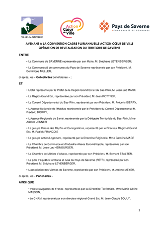 Les Communes de Saverne et d'Haguenau ont été retenues dans le programme "Action Cœur de Ville" qui vise à revitaliser leurs centres-villes autour de cinq axes : le commerce, l'habitat, le transport, le numérique et le patrimoine. Dans cette dynamique, la Communauté d'Agglomération de Haguenau et la Communauté de Communes du Pays de Saverne ont souhaité conventionner pour la mise en place d'une Opération de Revitalisation Territoriale. Cette dynamique s'inscrit en complémentarité avec les politiques départementales dans les domaines du développement territorial et de la cohésion sociale. Le présent rapport propose à la Commission Permanente d'approuver les termes du projet d'avenant à la convention "Action cœur de Ville" pour la mise en œuvre de l'Opération de Revitalisation Territoriale de Saverne à conclure entre le Département, l'ANAH, l'Etat, la Caisse des Dépôts et de Consignations, Action Logement, l'Agence Régionale de Santé, la Région et la Ville et la Communauté de Communes de Saverne pour la période 2019-2025.