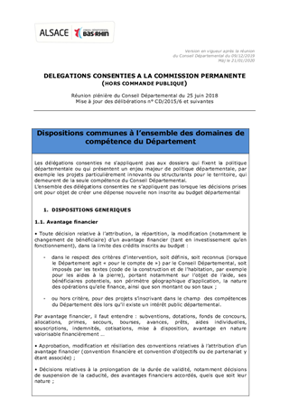 Pour faciliter la vie des habitants et des acteurs locaux, ainsi que pour améliorer l'efficacité et la réactivité de l'action publique, le Conseil Départemental est dans l'obligation d'actualiser régulièrement son processus décisionnel. Ce rapport propose au Conseil Départemental, compte tenu des besoins nouveaux apparus, de consentir de nouvelles délégations à la Commission Permanente dans trois domaines.