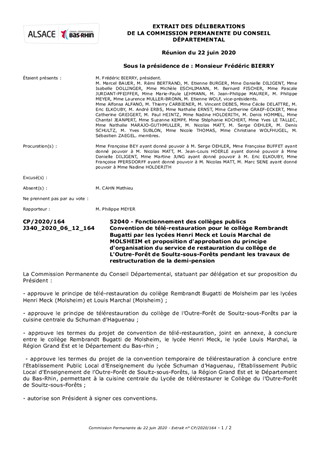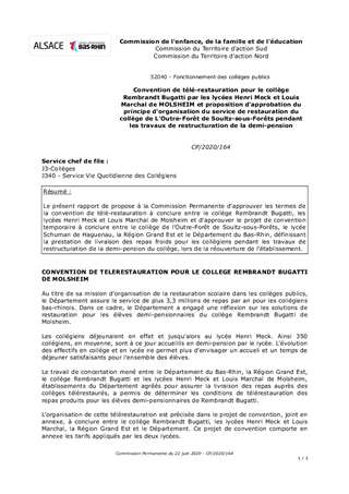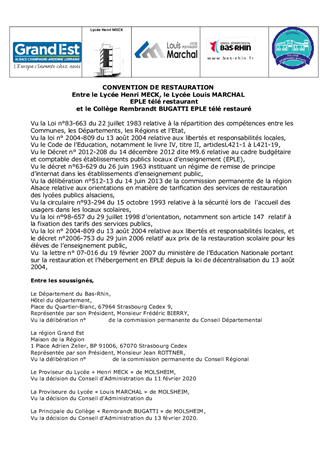 Le présent rapport de propose à la Commission Permanente d'approuver les termes de la convention de télé-restauration à conclure entre le collège Rembrandt Bugatti, les lycées Henri Meck et Louis Marchal de Molsheim et d'approuver le projet de convention temporaire à conclure entre le collège de l'Outre-Forêt de Soultz-sous-Forêts, le lycée Schuman de Haguenau, la Région Grand Est et le Département du Bas-Rhin, définissant la prestation de livraison des repas froids pour les collégiens pendant les travaux de restructuration de la demi-pension du collège, lors de la réouverture de l’établissement.