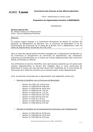 Le présent rapport propose à la Commission Permanente de décider du transfert de parcelles du Département du Bas-Rhin vers la Commune de Barembach et de la Communauté de Communes de la Vallée de la Bruche vers le Département, dans le cadre de régularisations d'emprises de la RD 1420.
