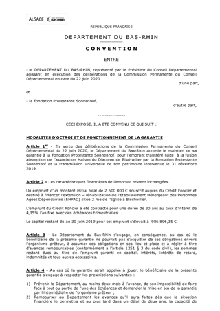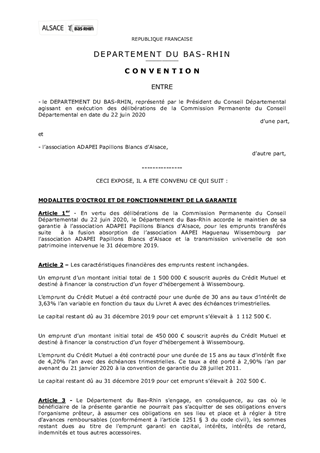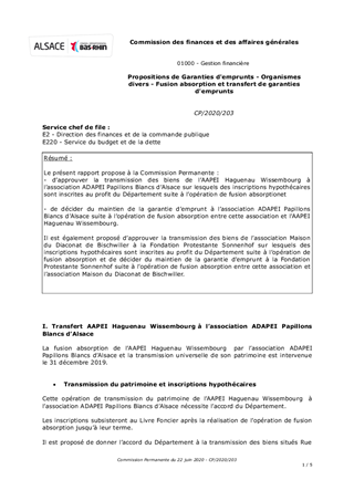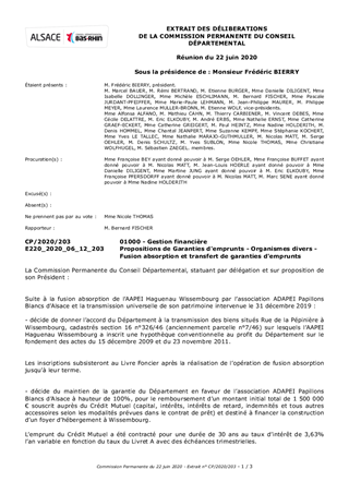 Le présent rapport propose à la Commission Permanente : - d’approuver la transmission des biens de l’AAPEI Haguenau Wissembourg à l’association ADAPEI Papillons Blancs d’Alsace sur lesquels des inscriptions hypothécaires sont inscrites au profit du Département suite à l’opération de fusion absorptionet - de décider du maintien de la garantie d’emprunt à l’association ADAPEI Papillons Blancs d’Alsace suite à l’opération de fusion absorption entre cette association et l’AAPEI Haguenau Wissembourg. Il est également proposé d’approuver la transmission des biens de l’association Maison du Diaconat de Bischwiller à la Fondation Protestante Sonnenhof sur lesquels des inscriptions hypothécaires sont inscrites au profit du Département suite à l’opération de fusion absorption et de décider du maintien de la garantie d’emprunt à la Fondation Protestante Sonnenhof suite à l’opération de fusion absorption entre cette association et l’association Maison du Diaconat de Bischwiller.