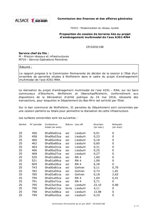 Le rapport propose à la Commission Permanente de décider de la cession à l'Etat d'un ensemble de parcelles situées à Wolfisheim dans le cadre du projet d'aménagement multimodal de l'axe A351-RN4.