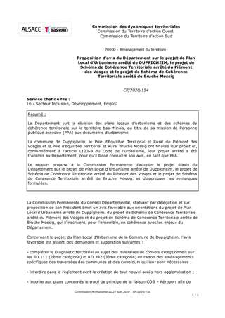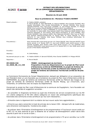 Le Département suit la révision des plans locaux d’urbanisme et des schémas de cohérence territoriale sur le territoire bas-rhinois, au titre de sa mission de Personne publique associée (PPA) aux documents d’urbanisme. La commune de Duppigheim, le Pôle d'Equilibre Territorial et Rural du Piémont des Vosges et le Pôle d'Equilibre Territorial et Rural Bruche Mossig ont finalisé leur projet et, conformément à l'article L123-9 du Code de l’urbanisme, leur projet arrêté a été transmis au Département, pour qu’il fasse connaître son avis, en tant que PPA. Le rapport propose à la Commission Permanente d’adopter le projet d’avis du Département sur le projet de Plan Local d’Urbanisme arrêté de Duppigheim, le projet de Schéma de Cohérence Territoriale arrêté du Piémont des Vosges et le projet de Schéma de Cohérence Territoriale arrêté de Bruche Mossig, et d’approuver les remarques formulées.