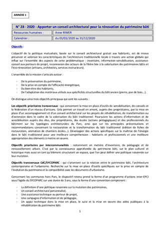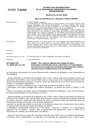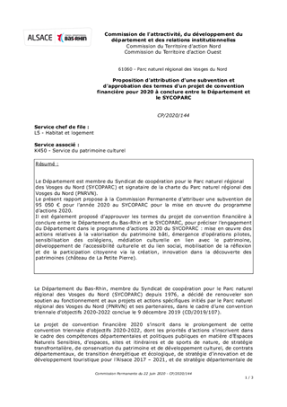 Le Département est membre du Syndicat de coopération pour le Parc naturel régional des Vosges du Nord (SYCOPARC) et signataire de la charte du Parc naturel régional des Vosges du Nord (PNRVN). Le présent rapport propose à la Commission Permanente d'attribuer une subvention de 95 050 € pour l'année 2020 au SYCOPARC pour la mise en œuvre du programme d’actions 2020. Il est également proposé d’approuver les termes du projet de convention financière à conclure entre le Département du Bas-Rhin et le SYCOPARC, pour préciser l’engagement du Département dans le programme d’actions 2020 du SYCOPARC : mise en œuvre des actions relatives à la valorisation du patrimoine bâti, émergence d’opérations pilotes, sensibilisation des collégiens, médiation culturelle en lien avec le patrimoine, développement de l’accessibilité culturelle et du lien social, mobilisation de la réflexion et de la participation citoyenne via la création, innovation dans la découverte des patrimoines (château de La Petite Pierre).