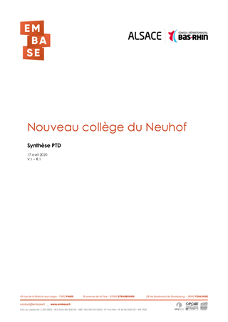 Le Conseil départemental a approuvé le plan pluriannuel d’investissement (PPI) des collèges en séance plénière des 20 mars 2017 (CD/2017/012), du 25 juin 2018 (CD/2018/022) et du 13 décembre 2018 (CD/2018/089). Dans ce cadre, le présent rapport a pour objet de proposer à la Commission Permanente d’engager les études de conception pour l’opération de construction du nouveau collège du Neuhof sur le site de l’ancien hôpital Lyautey à Strasbourg. Il est proposé à la Commission Permanente d’approuver le Programme Technique Détaillé qui définit le périmètre de l’opération ainsi que son budget prévisionnel en phase de conception.