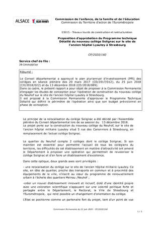 Proposition d'approbation du Programme technique Détaillé du nouveau collège Solignac sur le site de l'ancien hôpital Lyautey à Strasbourg