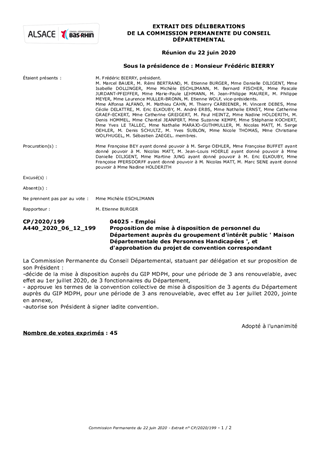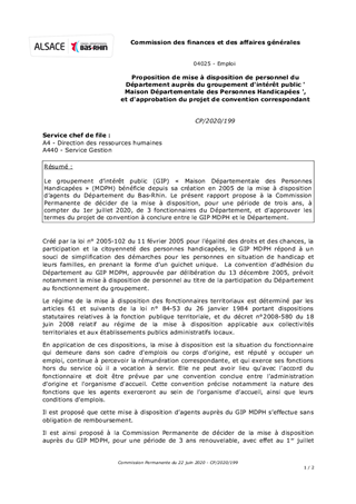 Le groupement d’intérêt public (GIP) « Maison Départementale des Personnes Handicapées » (MDPH) bénéficie depuis sa création en 2005 de la mise à disposition d’agents du Département du Bas-Rhin. Le présent rapport propose à la Commission Permanente de décider de la mise à disposition, pour une période de trois ans, à compter du 1er juillet 2020, de 3 fonctionnaires du Département, et d’approuver les termes du projet de convention à conclure entre le GIP MDPH et le Département.