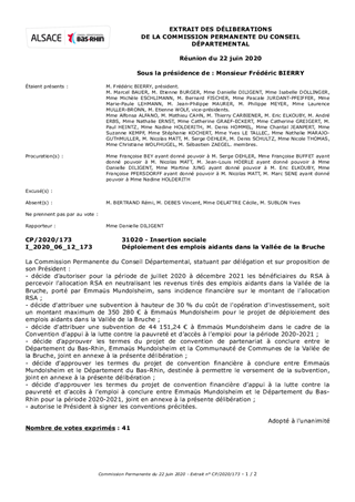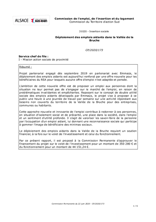 Projet partenarial engagé dès septembre 2019 en partenariat avec Emmaüs, le déploiement des emplois aidants est aujourd’hui renforcé par une offre nouvelle pour les bénéficiaires du RSA pour lesquels aucune offre d’emploi n’est adaptée et pensée. L’ambition de cette nouvelle offre est de proposer un emploi aux personnes dont la situation ne leur permet pas de s’engager sur le marché de l’emploi, en raison de problématiques invalidantes et empêchantes. Reposant sur le concept de double utilité sociale des emplois aidants développés par Emmaüs, le projet vise à proposer à ce public une heure à une journée de travail par semaine sur une activité répondant aux besoins non couverts du territoire de la Vallée de la Bruche pour des entreprises, communes ou habitants. Cette approche nouvelle et innovante de l’emploi contribue à redonner à ces personnes, en situation d’isolement social et de précarité, une place dans la société, dans l'emploi et un sentiment d'utilité profonde. Il s’agit de valoriser les savoir-faire de la personne par l’occupation d’un emploi aidant, lui donnant une reconnaissance sociale qui participe à gommer l’image de bénéficiaire des minimas sociaux. Le déploiement des emplois aidants dans la Vallée de la Bruche requiert un soutien financier, à la fois sur le volet de l’investissement et celui du fonctionnement. Par ce présent rapport, il est proposé à la Commission Permanente d’approuver le financement du projet sur le volet de l’investissement pour un montant de 350 280 € et du fonctionnement pour un montant de 44 151,24 €.