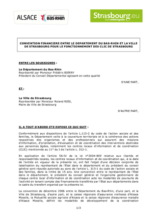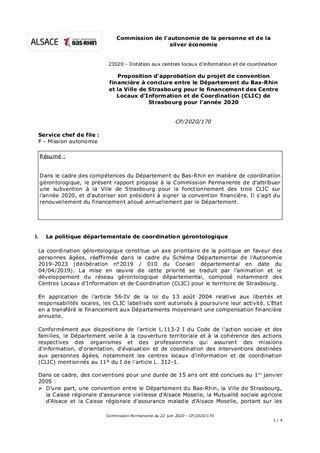 Dans le cadre des compétences du Département du Bas-Rhin en matière de coordination gérontologique, le présent rapport propose à la Commission Permanente de d’attribuer une subvention à la Ville de Strasbourg pour le fonctionnement des trois CLIC sur l’année 2020, et d’autoriser son président à signer la convention financière. Il s’agit du renouvellement du financement alloué annuellement par le Département.