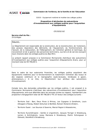 Le Département est responsable de la construction, de la reconstruction, de l'extension, des grosses réparations des bâtiments, de l'équipement, du fonctionnement, de l’accueil, de la restauration, de l’hébergement, de l’entretien général et technique, du recrutement et de la gestion des personnels techniciens, ouvriers et de service exerçant leurs missions dans les collèges publics du Bas-Rhin. Le présent rapport propose à la Commission Permanente d'attribuer des subventions d'investissement aux collèges publics pour l'acquisition d'équipements divers, pour un montant total de 99 798,00 €.