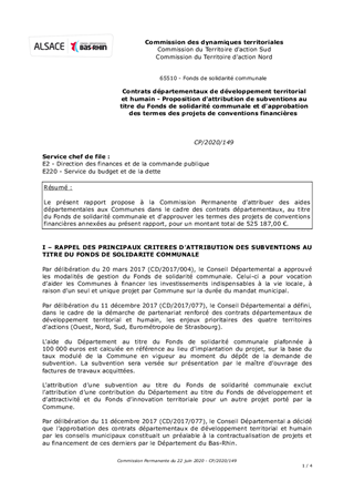 Le présent rapport propose à la Commission Permanente d’attribuer des aides départementales aux Communes dans le cadre des contrats départementaux, au titre du Fonds de solidarité communale et d'approuver les termes des projets de conventions financières annexées au présent rapport, pour un montant total de 525 187,00 €.