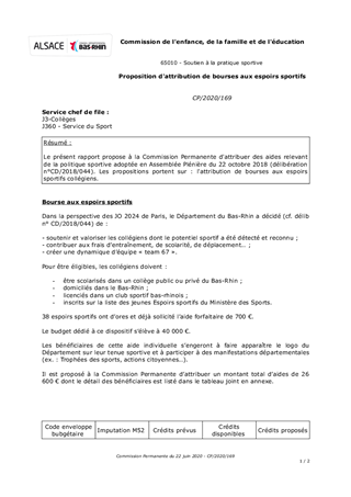 Le présent rapport propose à la Commission Permanente d'attribuer des aides relevant de la politique sportive adoptée en Assemblée Plénière du 22 octobre 2018 (délibération n°CD/2018/044). Les propositions portent sur : l'attribution de bourses aux espoirs sportifs collégiens.