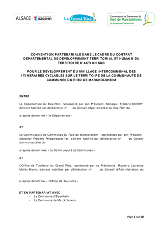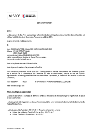 Le Conseil Départemental du Bas-Rhin a décidé, par délibération n° CD/2016/158 du 8 décembre 2016 et n° CD/2017/004 du 20 mars 2017, de développer un partenariat renforcé avec les acteurs locaux au travers de contrats départementaux de développement territorial et humain. Ces contrats constituent le volet stratégique du partenariat engagé par le Département avec les acteurs locaux sur la période 2018-2021. Ils ont vocation à traduire une ambition collective à l’échelle de chaque territoire d’action du Département et à définir les enjeux prioritaires d’aménagement et de développement co-construits avec les acteurs des territoires. Dans ce cadre, le Conseil Départemental a approuvé le contrat départemental de développement territorial et humain du territoire d’Action Sud, le 11 décembre 2017. Les projets d’aménagement de liaisons cyclables s’inscrivent dans les enjeux prioritaires pour « Aménager des territoires connectés et attractifs, à énergie positive et développer l'emploi », et « Développer nos sites de tourisme et de loisirs notamment par une meilleure mobilité ». Ces projets ambitionnent de compléter le maillage d’aménagements cyclables sur le territoire, d’une part en raccordant la Commune de Marckolsheim à l’itinéraire structurant du canal du Rhône au Rhin, et d’autre part en reliant les réseaux d’aménagements cyclables Haut-Rhinois et Bas-Rhinois. Le présent rapport propose à la Commission Permanente d’attribuer une subvention de 49 500 € au titre du Fonds de Développement et d’Attractivité, d’approuver les termes du projet de convention partenariale à conclure avec la Communauté de Communes du Ried de Marckolsheim et l’Office de Tourisme du Grand Ried, ainsi que d’approuver le projet de convention financière à conclure avec la Communauté de Communes du Ried de Marckolsheim.