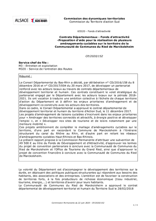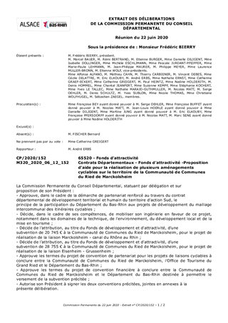 Contrats Départementaux - Fonds d'attractivité -Proposition d'aide pour la réalisation de plusieurs aménagements cyclables sur le territoire de la Communauté de Communes du Ried de Marckolsheim