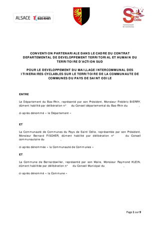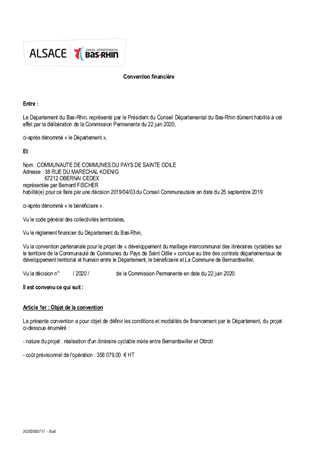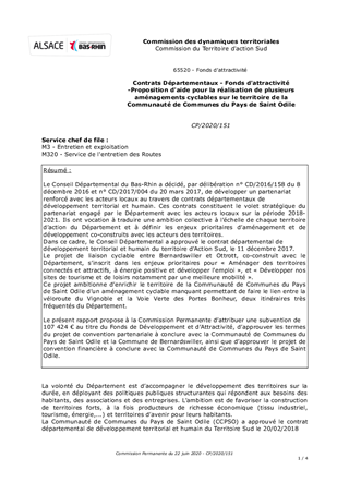 Le Conseil Départemental du Bas-Rhin a décidé, par délibération n° CD/2016/158 du 8 décembre 2016 et n° CD/2017/004 du 20 mars 2017, de développer un partenariat renforcé avec les acteurs locaux au travers de contrats départementaux de développement territorial et humain. Ces contrats constituent le volet stratégique du partenariat engagé par le Département avec les acteurs locaux sur la période 2018-2021. Ils ont vocation à traduire une ambition collective à l’échelle de chaque territoire d’action du Département et à définir les enjeux prioritaires d’aménagement et de développement co-construits avec les acteurs des territoires. Dans ce cadre, le Conseil Départemental a approuvé le contrat départemental de développement territorial et humain du territoire d’Action Sud, le 11 décembre 2017. Le projet de liaison cyclable entre Bernardswiller et Ottrott, co-construit avec le Département, s’inscrit dans les enjeux prioritaires pour « Aménager des territoires connectés et attractifs, à énergie positive et développer l'emploi », et « Développer nos sites de tourisme et de loisirs notamment par une meilleure mobilité ». Ce projet ambitionne d’enrichir le territoire de la Communauté de Communes du Pays de Saint Odile d’un aménagement cyclable manquant permettant de faire le lien entre la véloroute du Vignoble et la Voie Verte des Portes Bonheur, deux itinéraires très fréquentés du Département. Le présent rapport propose à la Commission Permanente d’attribuer une subvention de 107 424 € au titre du Fonds de Développement et d’Attractivité, d’approuver les termes du projet de convention partenariale à conclure avec la Communauté de Communes du Pays de Saint Odile et la Commune de Bernardswiller, ainsi que d’approuver le projet de convention financière à conclure avec la Communauté de Communes du Pays de Saint Odile.