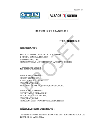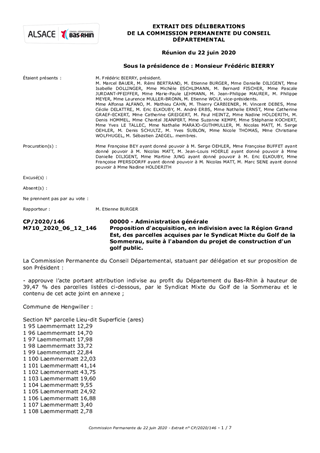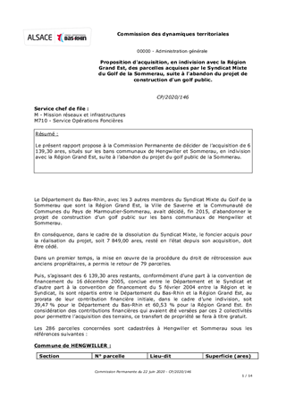 Le présent rapport propose à la Commission Permanente de décider de l’acquisition de 6 139,30 ares, situés sur les bans communaux de Hengwiller et Sommerau, en indivision avec la Région Grand Est, suite à l’abandon du projet du golf public de la Sommerau.