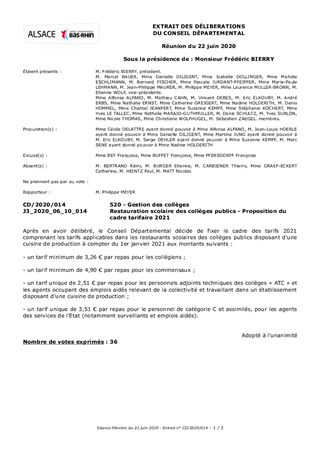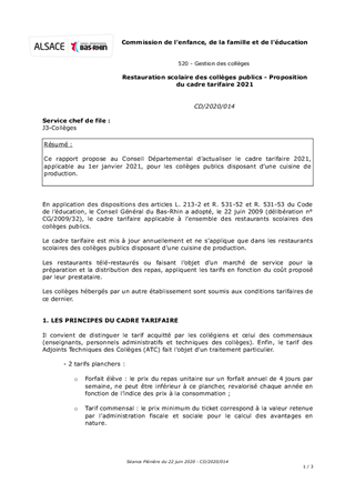 Ce rapport propose au Conseil Départemental d’actualiser le cadre tarifaire 2021, applicable au 1er janvier 2021, pour les collèges publics disposant d’une cuisine de production.