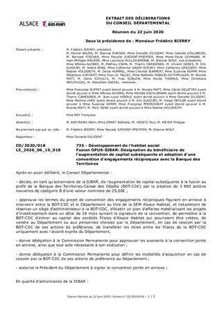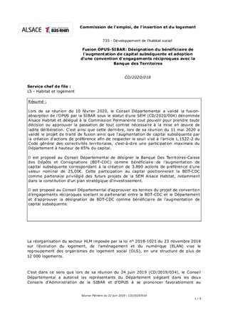 Lors de sa réunion du 10 février 2020, le Conseil Départemental a validé la fusion-absorption de l'OPUS par la SIBAR sous le statut d'une SEM (CD/2020/004) dénommée Alsace Habitat et délégué à la Commission Permanente tout pouvoir pour prendre toute décision ou approuver la passation de tout contrat nécessaire à la mise en œuvre de ladite délibération. C'est ainsi que cette dernière, lors de sa réunion du 11 mai 2020 a validé le projet de traité de fusion ainsi que l’augmentation de capital subséquente par la création d’actions de préférence afin de respecter le seuil visé à l’article L.1522-2 du Code général des collectivités territoriales, c’est-à-dire une participation maximale du Département à hauteur de 85% du capital. Il est proposé au Conseil Départemental de désigner la Banque Des Territoires-Caisse des Dépôts et Consignations (BDT-CDC) comme bénéficiaire de l’augmentation de capital subséquente correspondant à la création de 3.890 actions de préférence d’une valeur nominal de 25,00€. Cette participation au capital positionnerait la BDT-CDC comme partenaire privilégié des futurs projets de la SEM Alsace Habitat, notamment dans la constitution d’un plan stratégique d’investissement. Il est proposé au Conseil Départemental d’approuver les termes du projet de convention d’engagements réciproques scellant le partenariat entre la BDT-CDC et le Département et d'approuver la désignation de BDT-CDC comme bénéficiaire de l’augmentation de capital subséquente.