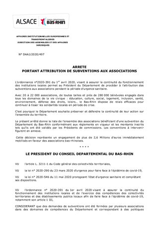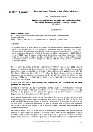 Le présent rapport a tout d‘abord pour objet de rendre compte des décisions prises en matière de subventions et de garanties d'emprunt par le Président du Conseil Départemental depuis la dernière réunion de la Commission Permanente le 11 mai 2020 sur le fondement du premier alinéa de l’article 1er III de l’ordonnance n° 2020-391 du 1er avril 2020 visant à assurer la continuité du fonctionnement des institutions locales et de l'exercice des compétences des collectivités territoriales et des établissements publics locaux afin de faire face à l'épidémie de covid-19. En outre, il définit le périmètre de ces délégations.