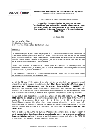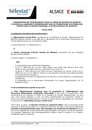 Le présent rapport a pour objet de proposer à la Commission Permanente de décider de la reconduction du partenariat avec le Centre Communal d'Action Sociale de SELESTAT et du renouvellement de l'aide financière du Département, pour la poursuite des actions menées par le Bureau d'Accès au Logement (BAL) sur le territoire d'action Sud, au titre de la politique volontariste du Département. Inscrit dans le Plan Départemental d'Action pour le Logement et l'Hébergement des Personnes Défavorisées (PDALHPD), le BAL vise à permettre à des ménages en difficulté d'accéder à un logement autonome. Il est également proposé à la Commission Permanente d'approuver les termes du projet de convention à conclure pour l'année 2020.