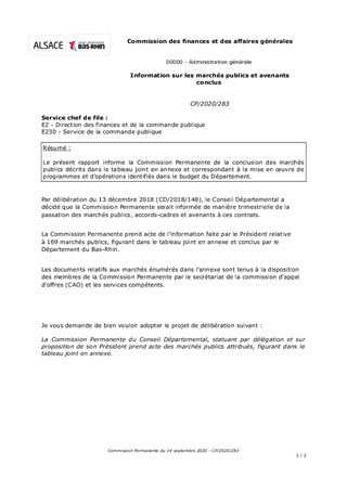 Le présent rapport informe la Commission Permanente de la conclusion des marchés publics décrits dans le tableau joint en annexe et correspondant à la mise en œuvre de programmes et d’opérations identifiés dans le budget du Département.