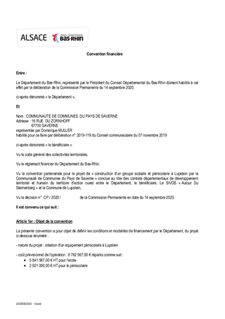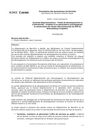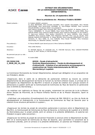 Le Département du Bas-Rhin a décidé, par délibération du Conseil Départemental n°CD/2016/158 du 8 décembre 2016 et CD/2017/004 du 20 mars 2017, de développer, sur la période 2018 – 2021, un partenariat renforcé avec les acteurs locaux en mettant en œuvre des contrats départementaux de développement territorial et humain. Ces contrats ont vocation à traduire une ambition collective à l’échelle de chaque territoire d’action du Département et à définir les enjeux prioritaires d’aménagement et de développement co-construits avec les acteurs des territoires. Il est proposé à la Commission Permanente d'attribuer une subvention d'investissement d'un montant de 584 200,00 €, au titre du Fonds de Développement et d'Attractivité, à la Communauté de Communes du Pays de Saverne pour la création d’un groupe scolaire et périscolaire à Lupstein.