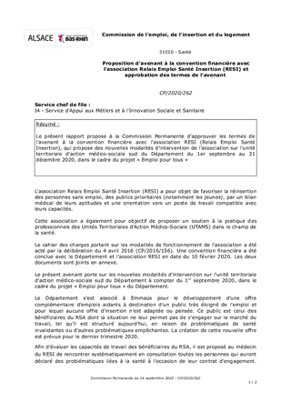 Le présent rapport propose à la Commission Permanente d’approuver les termes de l’avenant à la convention financière avec l’association RESI (Relais Emploi Santé Insertion), qui propose des nouvelles modalités d’intervention de l’association sur l’unité territoriale d’action médico-sociale sud du Département du 1er septembre au 31 décembre 2020, dans le cadre du projet « Emploi pour tous »