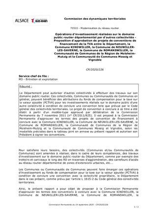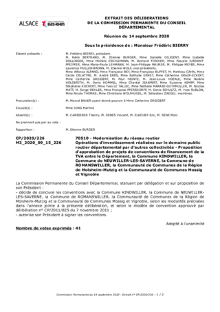 Opérations d'investissement réalisées sur le domaine public routier départemental par d'autres collectivités - Proposition d'approbation de projets de conventions de financement de la TVA entre le Département, la Commune KINDWILLER, la Commune de NEUWILLER-LES-SAVERNE, la Commune de ROMANSWILLER, la Communauté de Communes de la Région de Molsheim-Mutzig et la Communauté de Communes Mossig et Vignoble