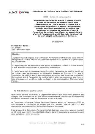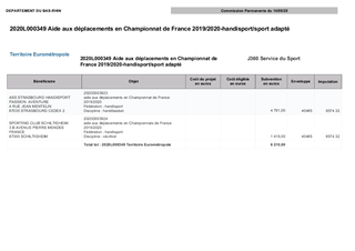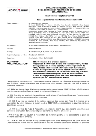 Le présent rapport propose à la Commission Permanente d'attribuer des aides relevant de la politique sportive adoptée en Assemblée Plénière du 22 octobre 2018 (délibération N°CD/2018/044). Il s'agit d'une part, de dispositifs d'aide révisés ou confirmés : aide à la licence scolaire et aide à la licence sportive et à la valorisation du bénévolat Il s'agit d'autre part de nouveaux dispositifs : aide à l'acquisition de matériel sportif par les collèges pour l'enseignement de l'Education Physique et Sportive (EPS), aide à l’acquisition du matériel sportif aux associations accueillant des personnes en situation de handicap, aide à l'acquisition de matériel sportif pour les associations sportives, et aide à l'engagement sportif des clubs handisport et de sport adapté en Championnat de France.