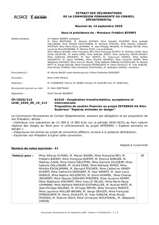 Le présent rapport propose à la Commission Permanente d'attribuer une subvention de 12 000 € au Parc naturel régional des Vosges du Nord (PNRVN) pour le cofinancement de son projet « Espèces animales en danger ». Ce projet transfrontalier, cofinancé à 50 % par des crédits européens FEDER dans le cadre du programme INTERREG Rhin Supérieur, vise à améliorer la protection sur le plan transfrontalier de trois espèces menacées : l’écrevisse des torrents, les azurés et les chauves-souris.