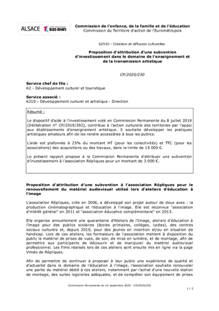 Le dispositif d’aide à l’investissement voté en Commission Permanente du 8 juillet 2019 (Délibération n° CP/2019/292), contribue à l’action culturelle des territoires par l’appui aux établissements d’enseignement artistique. Il souhaite développer les pratiques artistiques amateurs afin de les rendre accessibles à tous les publics. L’aide est plafonnée à 25% du montant HT (pour les collectivités) et TTC (pour les associations) des acquisitions ou des travaux, dans la limite de 15 000 €. Le présent rapport propose à la Commission Permanente d’attribuer une subvention d’investissement à l’association Répliques pour un montant de 3 000 €.