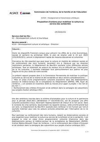 Outre les dispositifs financiers conçus pour prévenir les effets de la crise économique, sociale et sanitaire du printemps 2020, le plan de relance voté le 22 juin 2020 (CD/2020/021), prévoit le déploiement rapide de mesures éducatives et culturelles. Convaincu du rôle essentiel que peut jouer la culture en matière de cohésion sociale et de renforcement des liens humains, durement mis à l’épreuve par les récentes restrictions sanitaires, le Département du Bas-Rhin souhaite initier différentes actions artistiques. Tout en soutenant les acteurs du secteur mis en difficulté par l’interruption de la vie culturelle, il souhaite s’adresser tout particulièrement aux publics les plus fragiles et les plus isolés de notre société. Le présent rapport propose donc à la Commission Permanente de mobiliser la politique culturelle au service de la relance et des solidarités en deux actions complémentaires : - Mise en place d’une programmation culturelle d’automne dans des établissements sociaux et médico-sociaux de la compétence du Département (EHPAD, IME, foyer de l’enfance...) en octobre et novembre 2020 au travers d’un appel à projets « De l’art et du lien » ; - Renforcement des critères d’inclusion et de cohésion dans la campagne de subventions aux projets d'action artistique 2021.