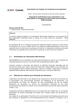 Le présent rapport propose à la Commission Permanente d’attribuer une subventions à une association intervenant dans le champ de la lutte contre les exclusions : SOS EMMAUS.