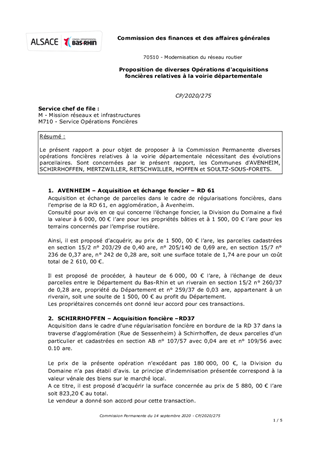 Le présent rapport a pour objet de proposer à la Commission Permanente diverses opérations foncières relatives à la voirie départementale nécessitant des évolutions parcellaires. Sont concernées par le présent rapport, les Communes d'AVENHEIM, SCHIRRHOFFEN, MERTZWILLER, RETSCHWILLER, HOFFEN et SOULTZ-SOUS-FORETS.