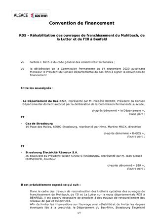 RD5 Réhabilitation des ouvrages de franchissement du Muhlbach, de l'Ill et de la Lutter à Benfeld Proposition de projet de convention de financement à conclure avec Strasbourg Electricité Réseau et Gaz de Strasbourg pour l'installation de nouveaux réseaux dans les ouvrages de franchissement
