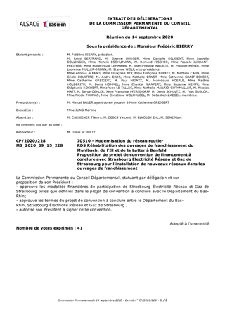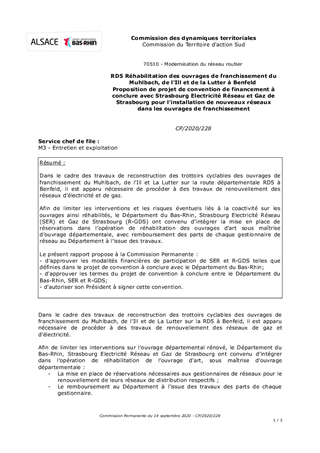 Dans le cadre des travaux de reconstruction des trottoirs cyclables des ouvrages de franchissement du Muhlbach, de l'Ill et La Lutter sur la route départementale RD5 à Benfeld, il est apparu nécessaire de procéder à des travaux de renouvellement des réseaux d’électricité et de gaz. Afin de limiter les interventions et les risques éventuels liés à la coactivité sur les ouvrages ainsi réhabilités, le Département du Bas-Rhin, Strasbourg Electricité Réseau (SER) et Gaz de Strasbourg (R-GDS) ont convenu d’intégrer la mise en place de réservations dans l’opération de réhabilitation des ouvrages d’art sous maîtrise d’ouvrage départementale, avec remboursement des parts de chaque gestionnaire de réseau au Département à l’issue des travaux. Le présent rapport propose à la Commission Permanente : - d'approuver les modalités financières de participation de SER et R-GDS telles que définies dans le projet de convention à conclure avec le Département du Bas-Rhin; - d'approuver les termes du projet de convention à conclure entre le Département du Bas-Rhin, SER et R-GDS; - d'autoriser son Président à signer cette convention.