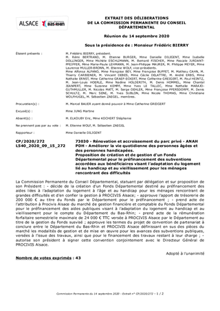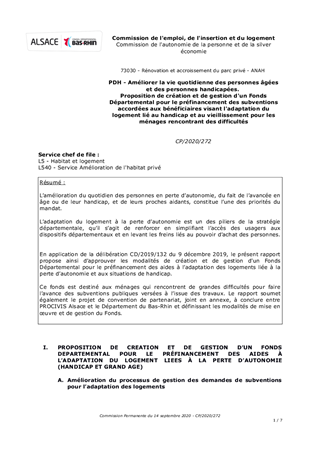 L’amélioration du quotidien des personnes en perte d’autonomie, du fait de l’avancée en âge ou de leur handicap, et de leurs proches aidants, constitue l’une des priorités du mandat. L’adaptation du logement à la perte d’autonomie est un des piliers de la stratégie départementale, qu’il s’agit de renforcer en simplifiant l’accès des usagers aux dispositifs départementaux et en levant les freins liés au pouvoir d’achat des personnes. En application de la délibération CD/2019/132 du 9 décembre 2019, le présent rapport propose ainsi d’approuver les modalités de création et de gestion d'un Fonds Départemental pour le préfinancement des aides à l’adaptation des logements liée à la perte d’autonomie et aux situations de handicap. Ce fonds est destiné aux ménages qui rencontrent de grandes difficultés pour faire l’avance des subventions publiques versées à l’issue des travaux. Le rapport soumet également le projet de convention de partenariat, joint en annexe, à conclure entre PROCIVIS Alsace et le Département du Bas-Rhin et définissant les modalités de mise en œuvre et de gestion du Fonds.