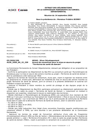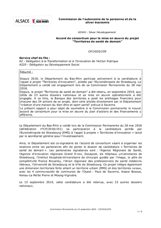 Depuis 2018, le Département du Bas-Rhin participe activement à la candidature à l'appel à projet "Territoires d'innovation", pilotée par l'Eurométropole de Strasbourg. Le Département a validé cet engagement lors de sa Commission Permanente du 28 mai 2018. Depuis, le projet "Territoires de santé de demain" a été retenu, en septembre 2019, aux côtés de 23 autres dossiers nationaux et sa mise en œuvre opérationnelle a été engagée. A ce titre, la Banque des territoires a posé les arbitrages financiers pour chacune des 34 actions de ce projet, dont celle pilotée directement par le Département "création d'une maison du bien-être et sport santé" prévue à Saverne. Le présent rapport a pour objet de soumettre à la Commission permanente le nouvel accord de consortium pour la mise en œuvre du plan d'actions et des financements y afférents.